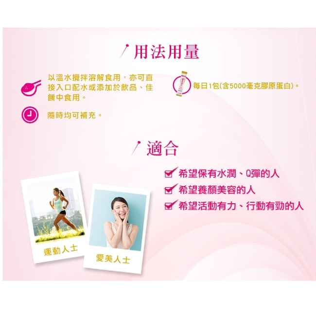 每日補充5000毫克膠原蛋白健康美麗加分靈活Q彈有力。