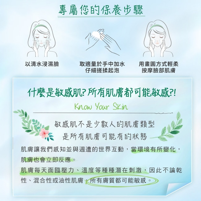 ‧ 添加天然來源植萃保濕成分#與礦物精華能深層且溫和清潔肌膚使用後肌膚清新、舒緩不緊繃適合缺水型及敏感性肌膚。
