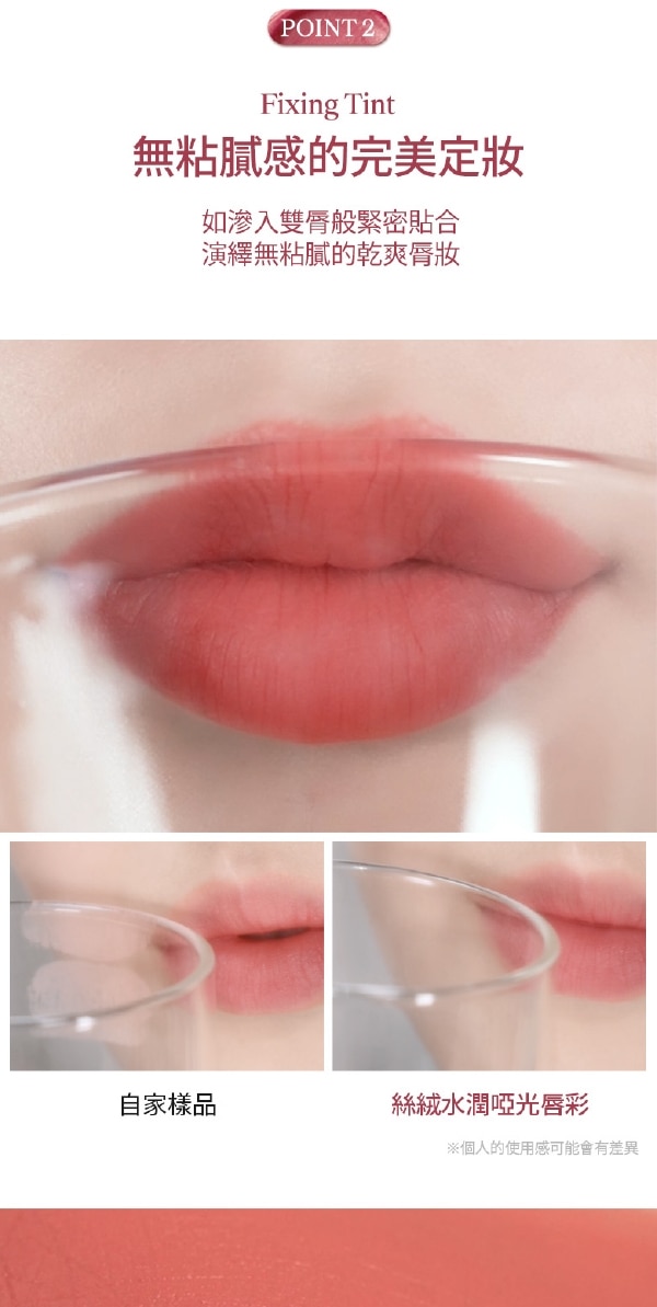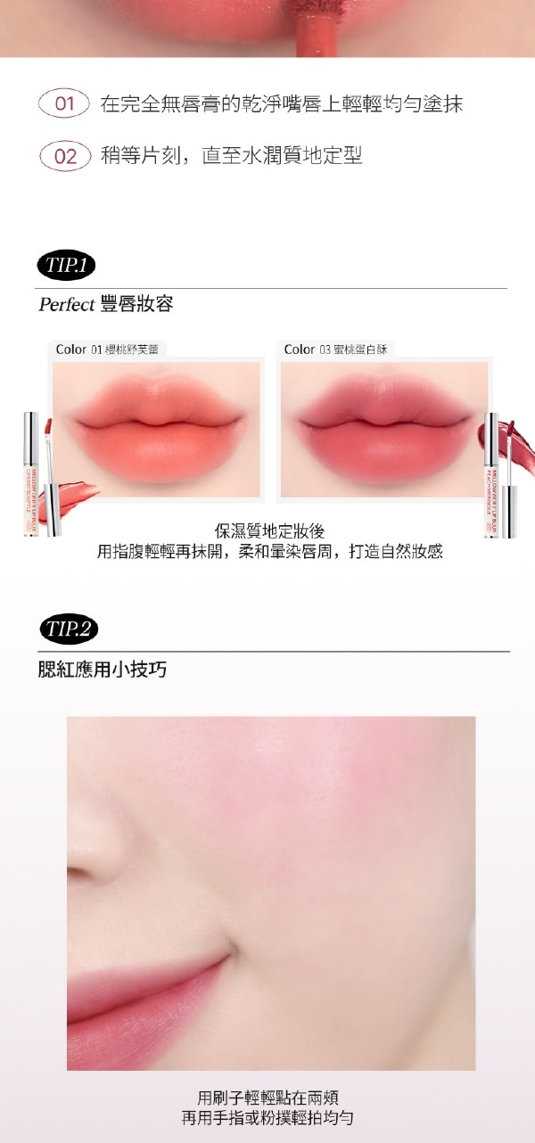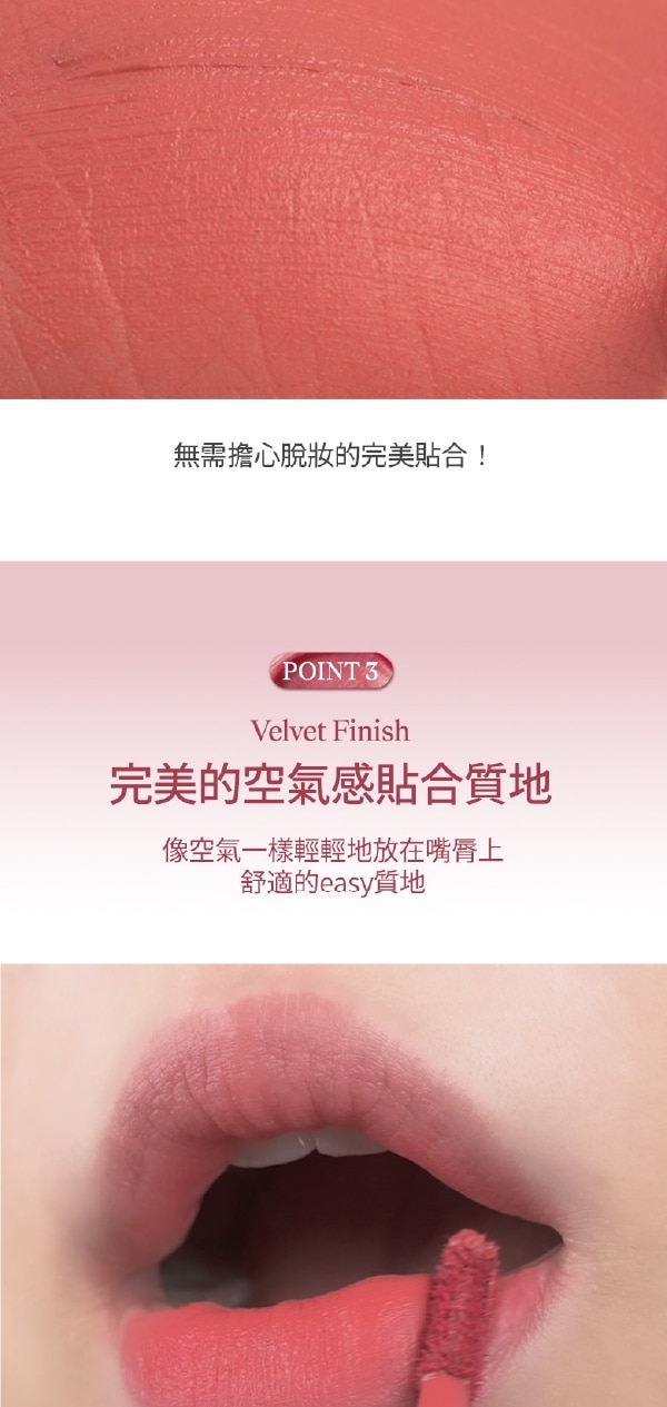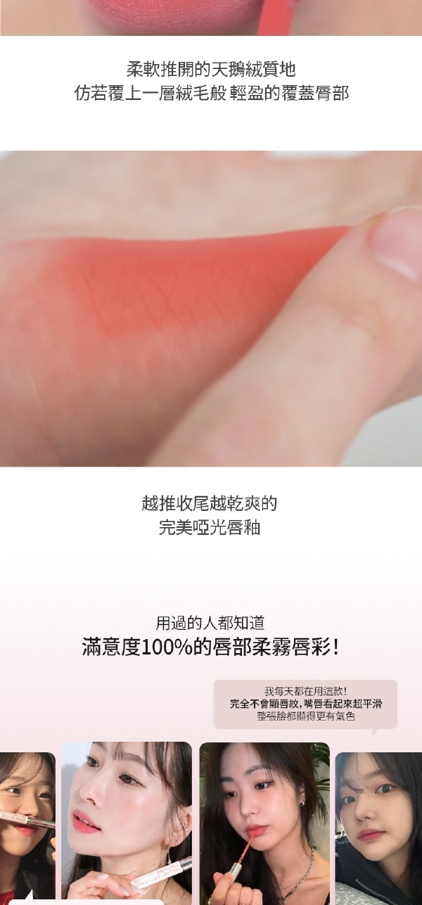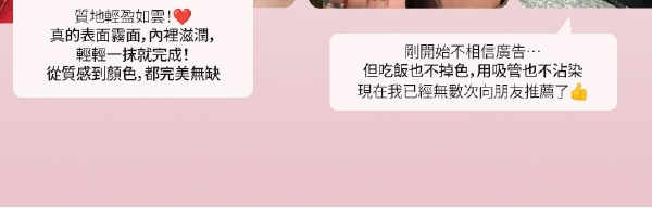 | 商品簡述 | 1.絲絨般柔滑質地輕柔融於雙唇 2水潤塗抹呈現自然柔霧妝感 3持久定色不沾杯、不脫妝 隱形唇紋 |