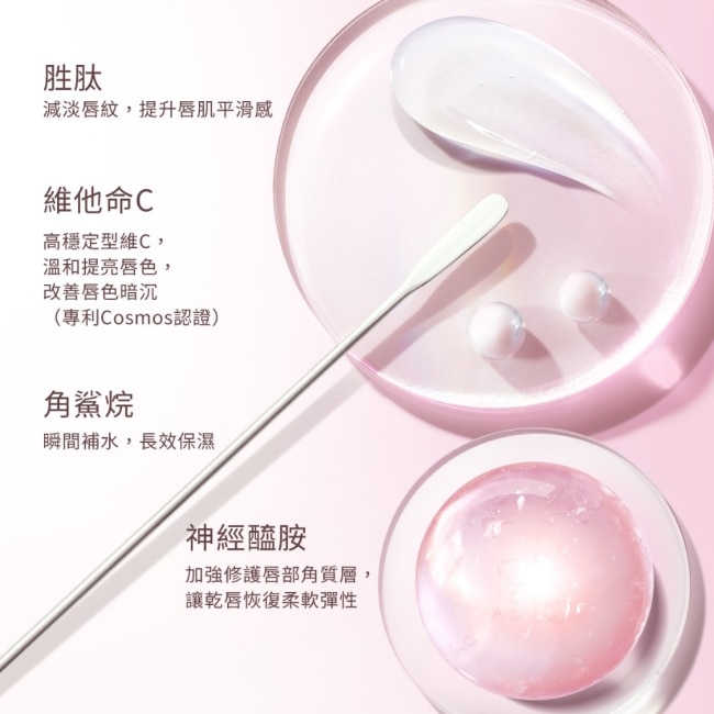添加玻尿酸、角鯊烷等保濕成分為唇部提供所需水分使雙唇維持柔軟舒適。