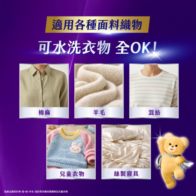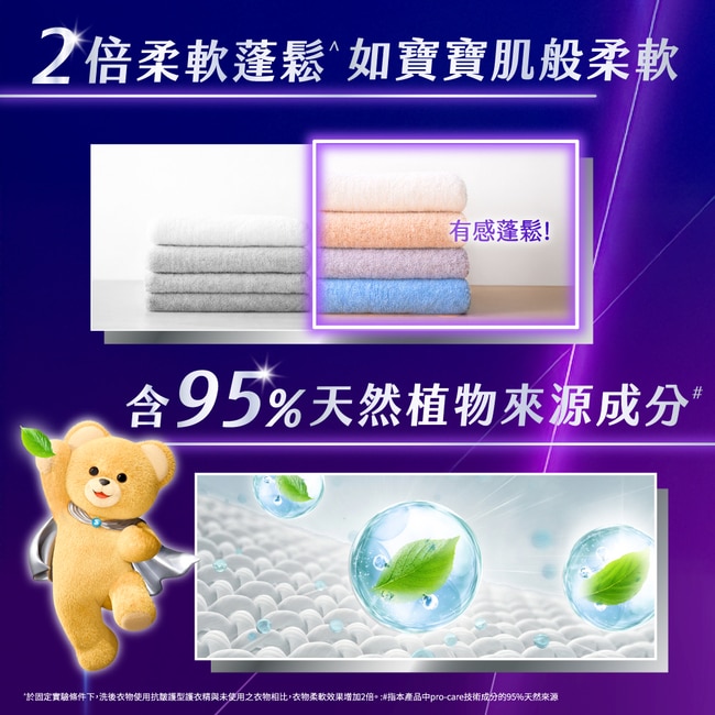 2 倍柔軟蓬鬆^,洗後觸感如寶寶肌般柔軟細緻,減少纖維摩擦帶來的不適感,讓全家大小都能享受溫和貼心的衣物呵護。