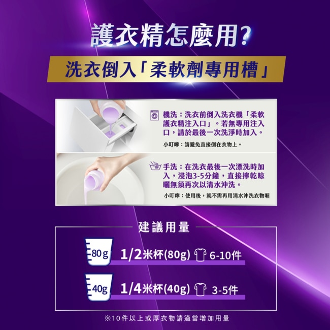 含天然植物來源成分,溫和配方設計,洗衣同時完成護型保養,讓衣物天天維持清新、柔軟又好穿。