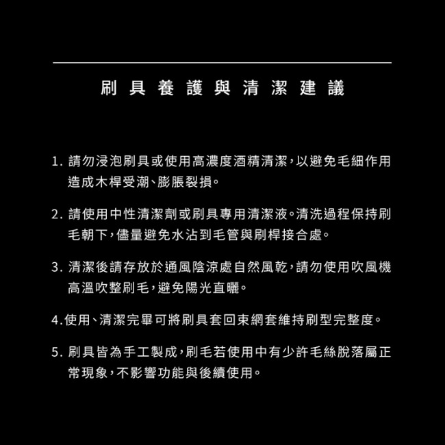 請存放於通風陰涼處避免陽光直曬。 2.清洗時為避免木質刷桿受潮損壞請避免木質刷桿碰水/長時間泡水或使用高濃度酒精清潔。 3. 請注意勿重壓導致刷毛變形降低刷具壽命。