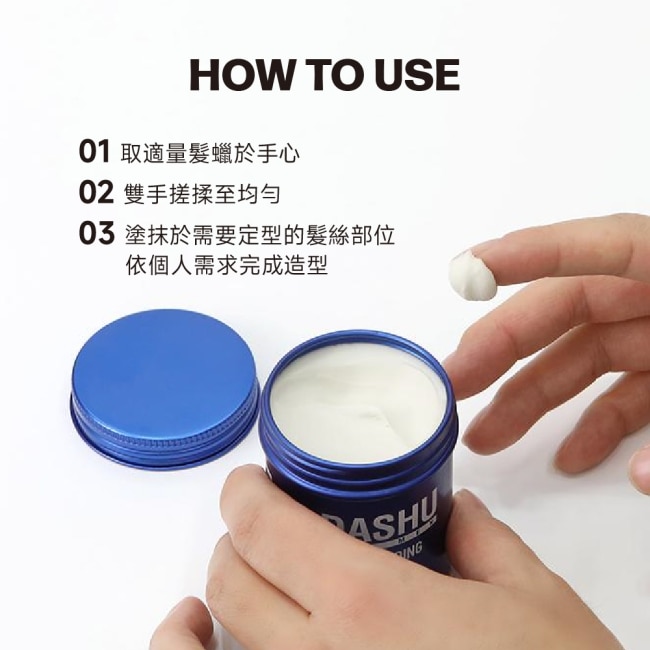 取適量髮蠟於手心雙手搓揉至均勻後塗抹於需要定型的髮絲部位依個人需求完成造型。