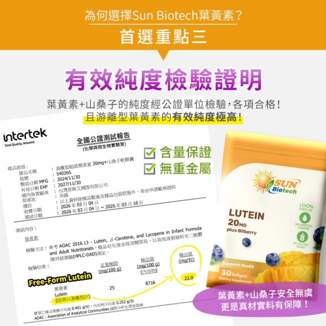 葉黃素+山桑子的純度經公證單位檢驗、各項合格
