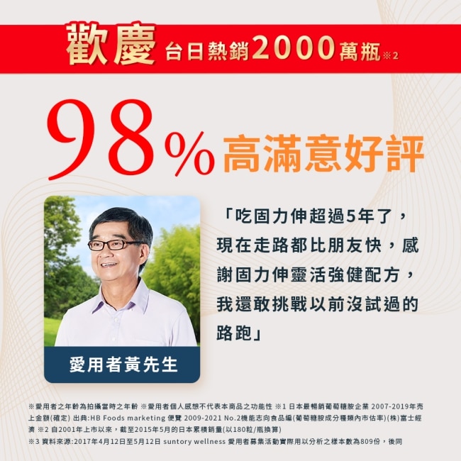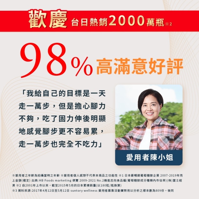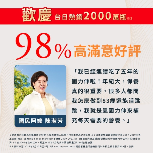 | 商品簡述 | 台日熱銷2千萬瓶、滿意度98%、順順行靈活 步步強健 一瓶就搞定、陳淑芳、楊貴媚 金馬影后雙推薦 |