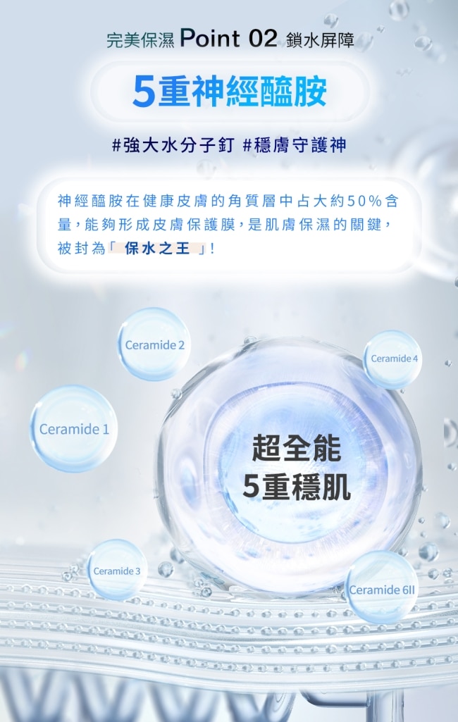 -保水之王5重神經醯胺,強大肌表防禦力搭載超導科技,精準滲透、高速吸收。