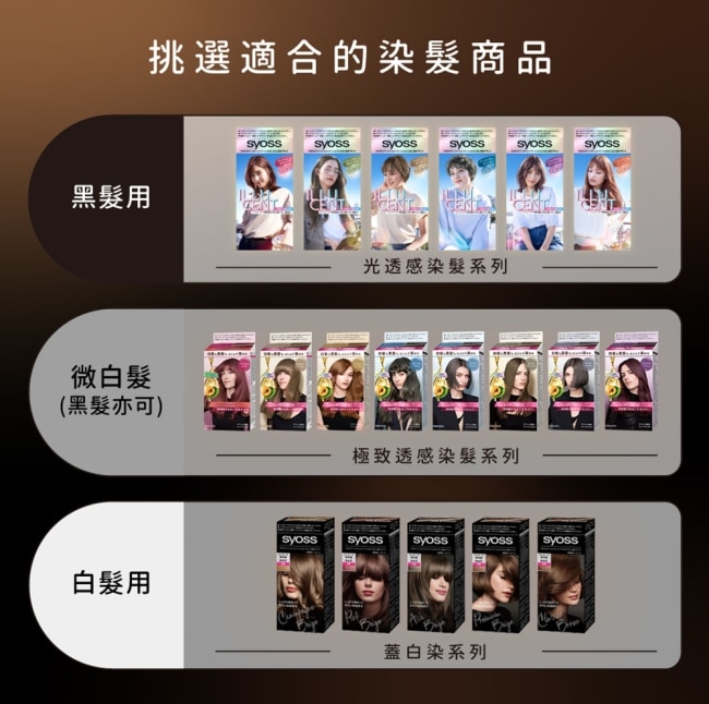 3. 超透光顯色黃金配比提升並改善微白髮與黑髮的透光度。