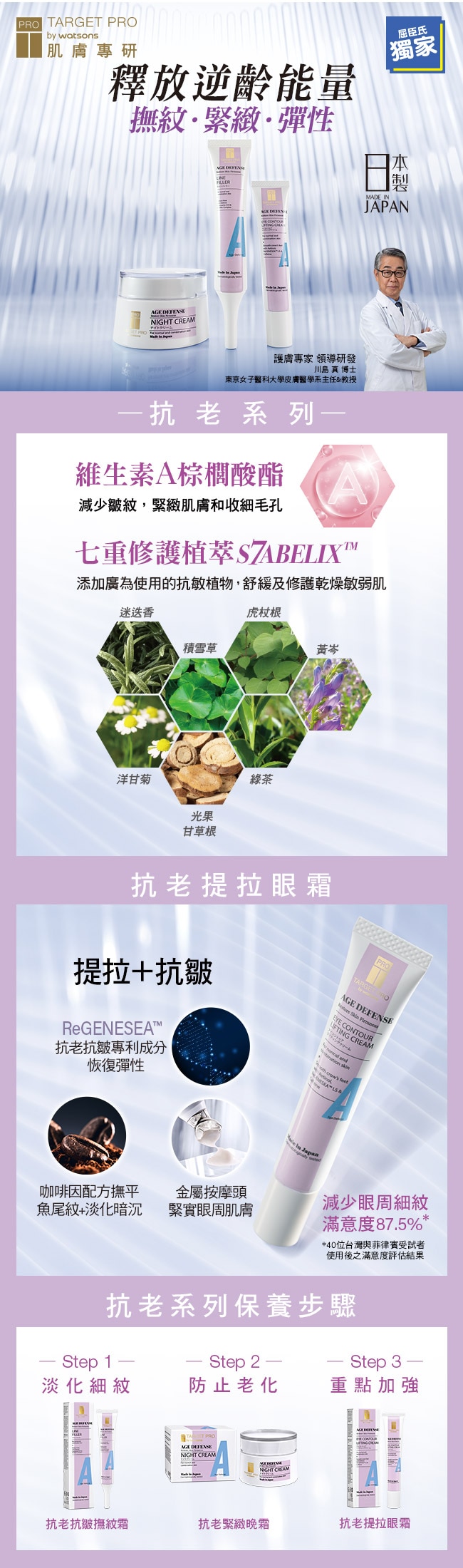TARGET PRO by Watsons 抗老緊緻系列揉合專利成分七重修護植萃 和維生素A醇棕櫚酸酯的先進配方, 可穩定肌膚狀態並防止老化。蘊含各種經臨床測試的成分,特別針對不同部位的肌膚老化問題。