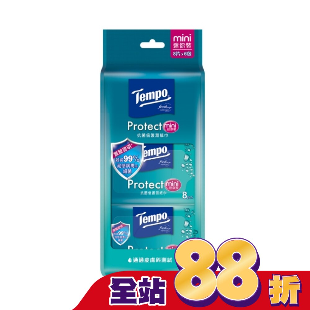 Tempo抗菌倍護濕巾迷你裝8抽×6包專為隨身攜帶設計輕巧便利放入口袋、包包、車上都適合隨時隨地保持雙手清潔。採用溫和配方含有效抗菌成分可有效去除99.9%常見細菌守護全家人的健康安全。濕巾材質柔韌細緻觸感舒適不刺激肌膚適合手部、物品擦拭或外出使用。特別添加保濕成分使用後肌膚不乾澀溫和呵護手部肌膚敏感肌也能安心使用。