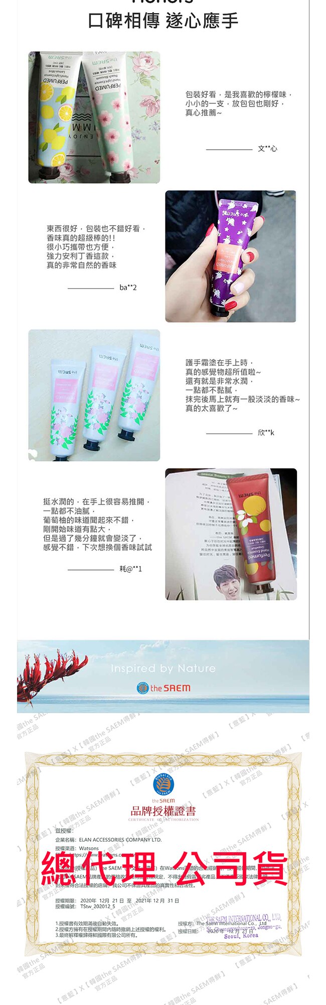 | 商品簡述 | the SAEM得鮮 香氛精華滋養護手霜30ml -鳶尾 |