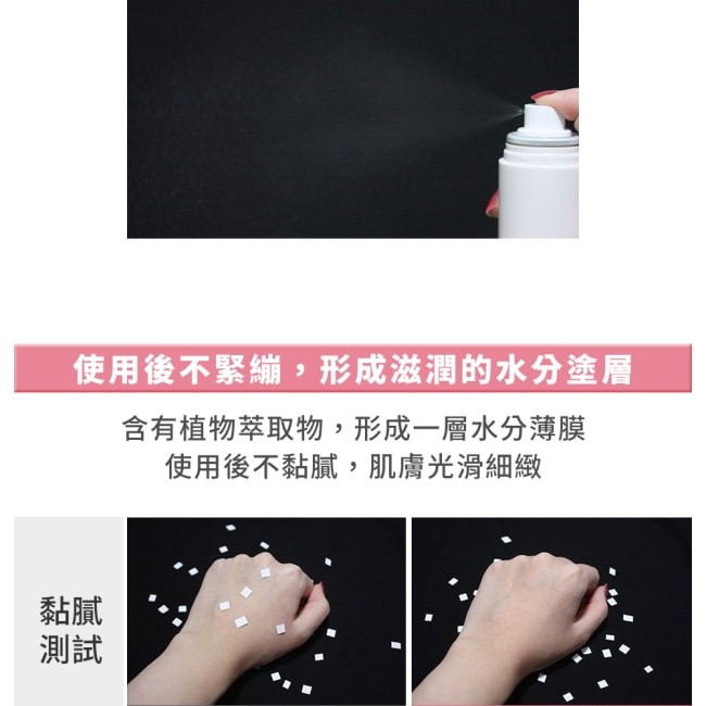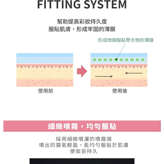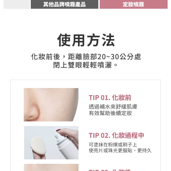 如需補妝可於輕拍底妝後再次噴灑少量使妝容重新貼合。