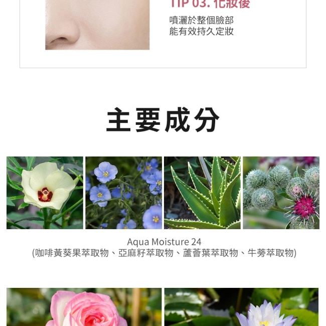 完成底妝後距離臉部約 20-30 公分均勻噴灑全臉。