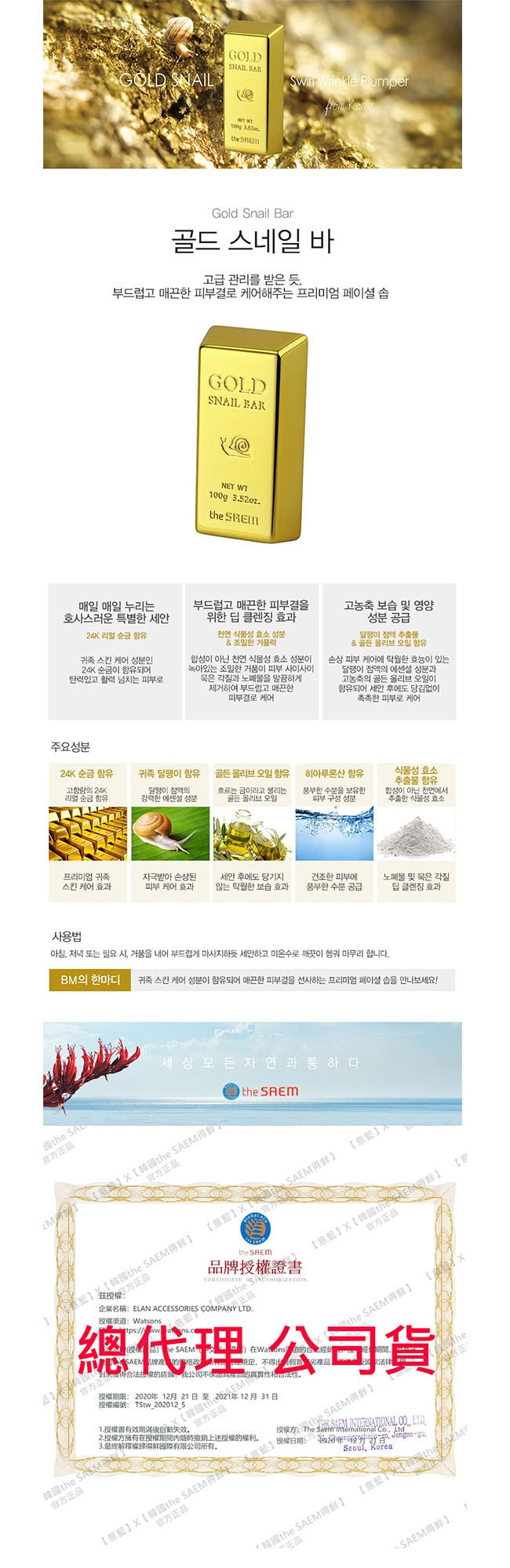 | 商品簡述 | 【韓國 THE SAEM 得鮮】黃金蝸牛洗面皂100g |