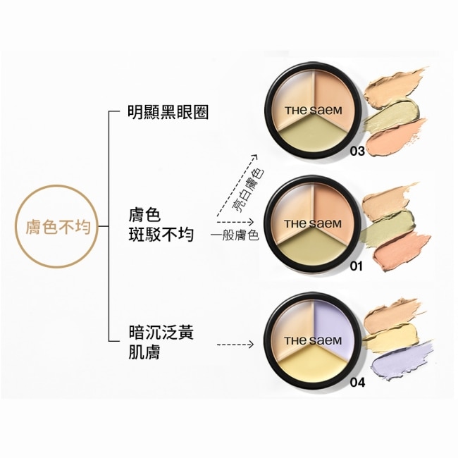 經典熱銷的三色遮瑕膏系列結合三種色調設計一盤即可完成遮瑕.修容.提亮多重修飾。細緻霜狀質地能自然貼合肌膚柔滑延展不卡粉輕鬆打造乾淨明亮的無瑕底妝。
