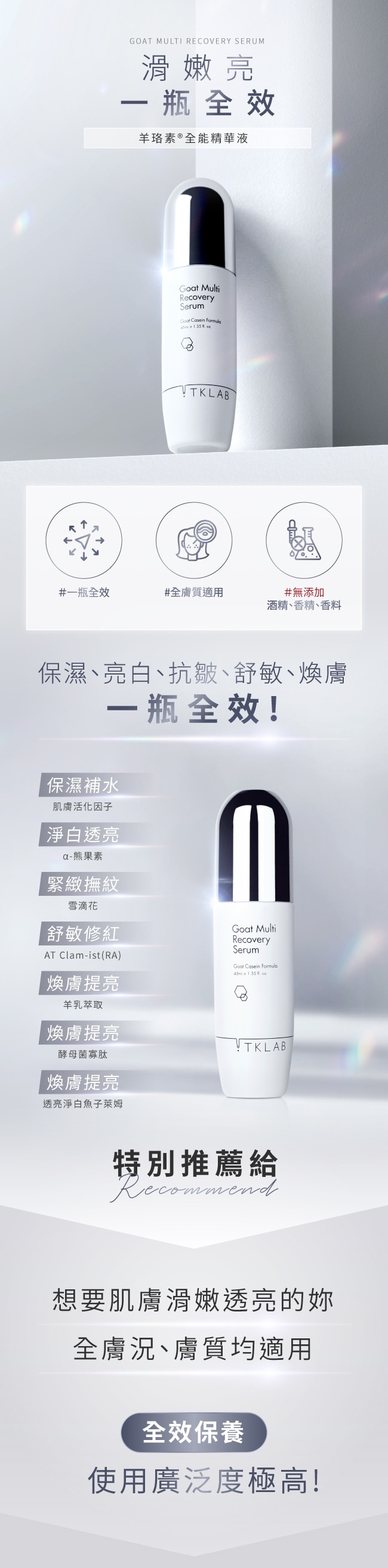 TKLAB羊珞素全能精華液一瓶全效可以擦在臉上後不用洗掉保濕、亮白、抗皺、舒敏、煥膚都有感水感微乳狀質地一抹即嫩養出滑嫩肌。