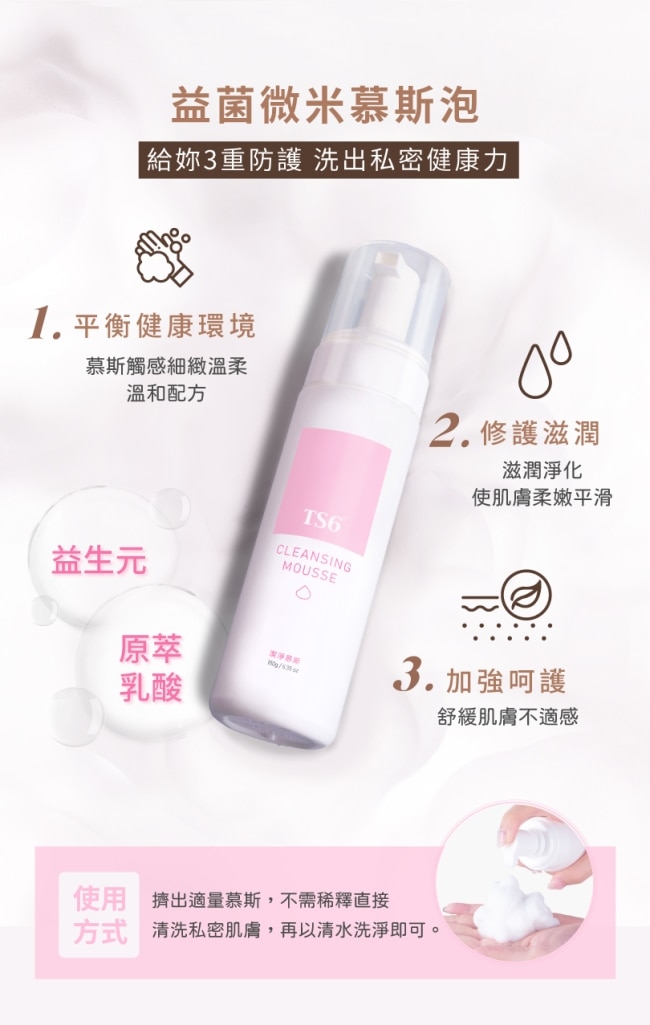 使用方法擠出適量慕斯不需稀釋直接清洗私密肌膚再以清水洗淨即可。溫和配方慕斯細緻柔和。
