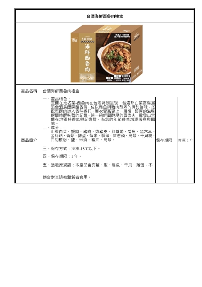 台酒海鮮西魯肉 1500g/盒(固形量750g)