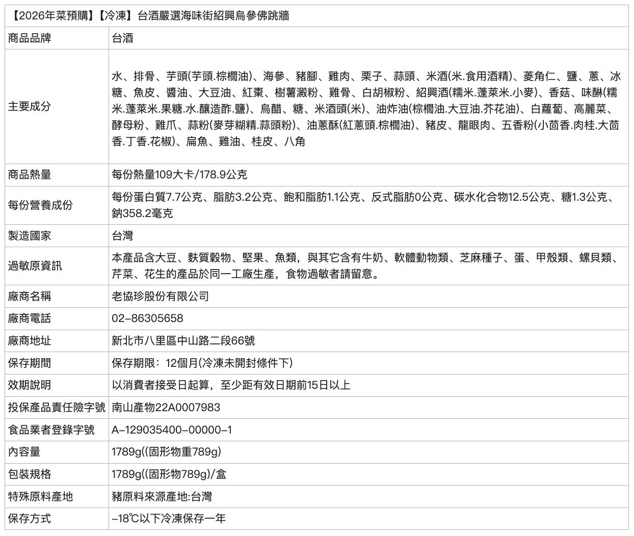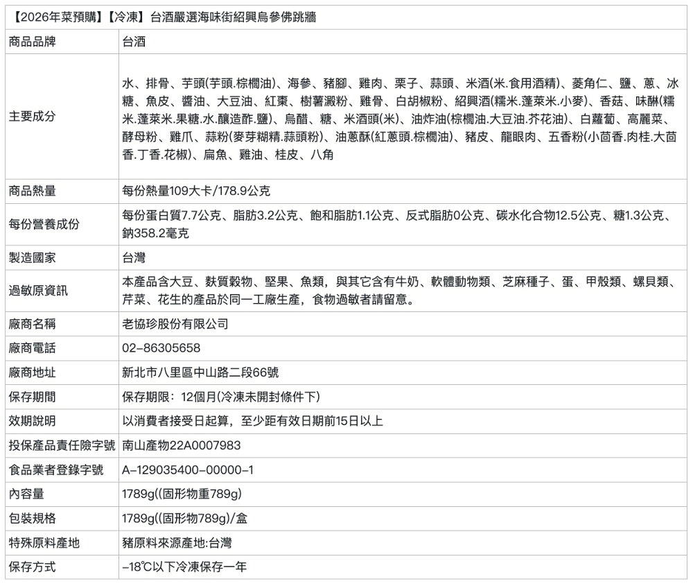 台酒嚴選海味街紹興烏參佛跳牆 1789g(固形物789g)
