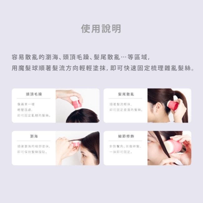 【使用方法】:整理好髮型後於髮型容易鬆散、毛躁的部位以魔髮球直接輕輕塗抹撫平髮絲。
