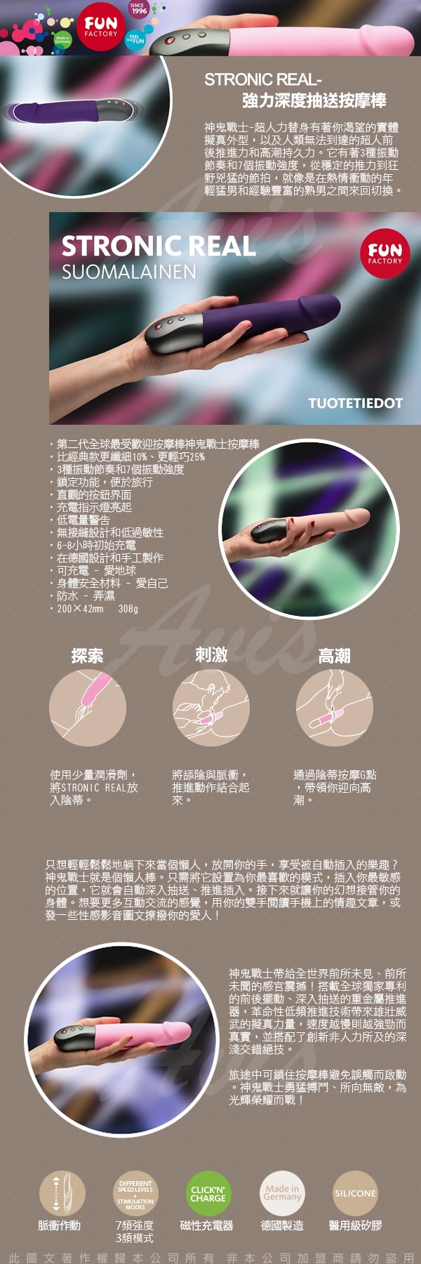 神鬼戰士-REAL瑞歐有著你渴望的實體擬真外型,以及人類無法到達的超人前後推進力和高潮持久力。只要你願意,隨時隨地都可以享受性愛高潮,你想要享受多久的高潮時間就有多久! 陰蒂比你想的要大,它實際上是一個整體結構,全面包覆著整個外陰。想要玩遍整個遊樂中心?獲得更全面更充分的高潮?它通過每次推力深入抽送、推進插入陰道內部和按摩陰蒂下半部的陰蒂腳。 它有著3種振動節奏和7個振動強度,從穩定的推力到狂野兇猛的節拍,就像是在熱情衝動的年輕猛男和經驗豐富的熟男之間來回切換。找到一個最適合你衝撞的節奏,抽離自已、放開身體,跟著自由穿梭在高潮之上,擴張你的高潮宇宙,讓你甚至會忘了自己的名字! 只想輕輕鬆鬆地躺下來當個懶人,放開你的手,享受被自動插入的樂趣?神鬼戰士就是個懶人棒。只需將它設置為你最喜歡的模式,插入你最敏感的位置,它就會自動深入抽送、推進插入。接下來就讓你的幻想接管你的身體。想要更多互動交流的感覺,用你的雙手閱讀手機上的情趣文章,或發一些性感影音圖文撩撥你的愛人! 神鬼戰士是稱霸競技場的鬥士,劃時代革命性的神器宣告了王者降臨!神鬼戰士優雅強健的外型是為了完美推進、深入抽送所設計。錐狀且略微傾斜且符合人體工學的頭部讓使用時更容易進入刺激G點,如山丘陵線突起的底部更加強了對陰蒂的刺激。神鬼戰士有著強勁豪邁的力量,前後擺動、深入抽送讓人心醉神迷,資深玩家會馬上被它所征服! 神鬼戰士帶給全世界前所未見、前所未聞的感官震撼!搭載全球獨家專利的前後擺動、深入抽送的重金屬推進器,革命性低頻推進技術帶來雄壯威武的擬真力量,速度越慢則越強勁而真實,並搭配了創新非人力所及的深淺交錯絕技。旅途中可鎖住按摩棒避免誤觸而啟動。神鬼戰士勇猛搏鬥、所向無敵,為光輝榮耀而戰!