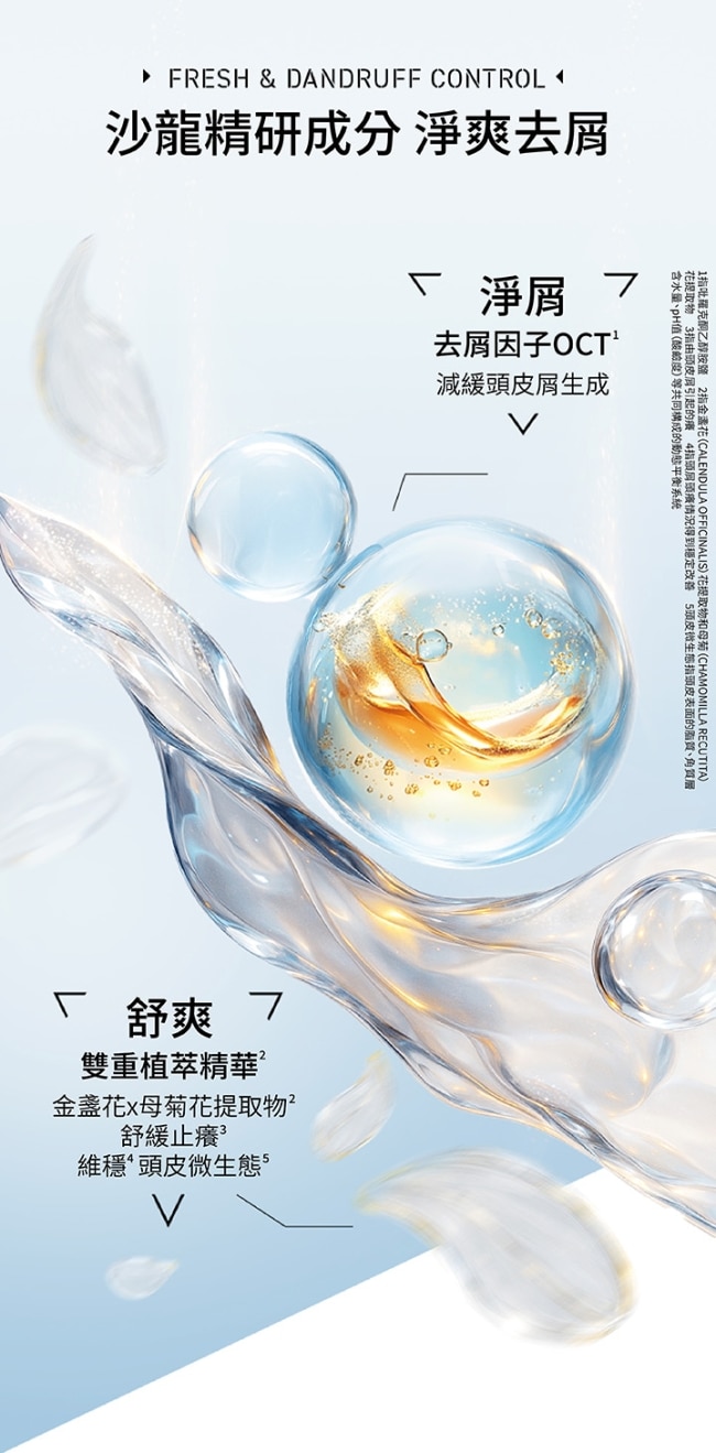淨屑平衡-針對頭皮屑及頭皮搔癢: 添加精萃去屑OCT X 金盞花和洋甘菊雙重植萃精華居家享受頭皮去屑護理