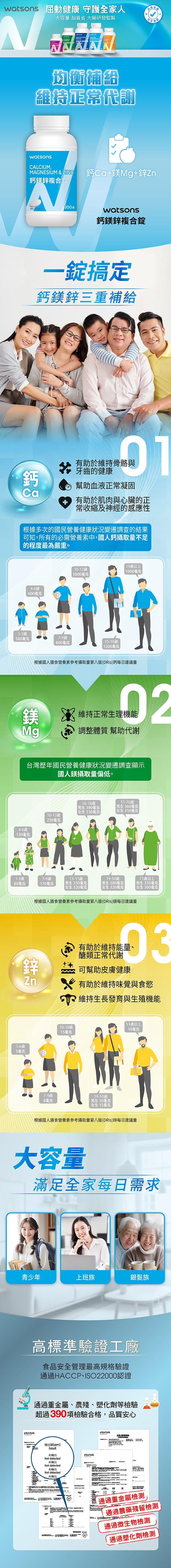 補充鈣鎂鋅是現代人維持健康的關鍵。Watsons 鈣鎂鋅複合錠以黃金比例調配提供鈣、鎂、鋅三重營養增強保護力。