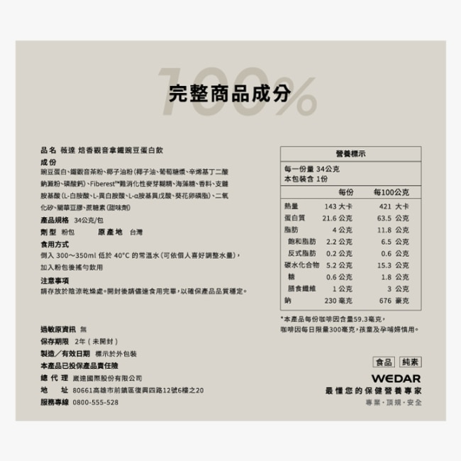 焙香觀音拿鐵每包(34g)咖啡因含量為59.3mg