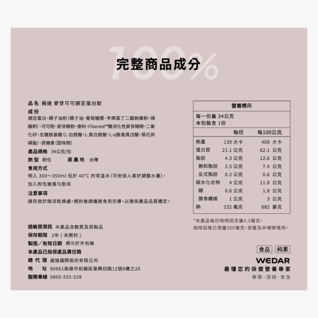 麥芽可可每包(34g)咖啡因含量為4.3mg
