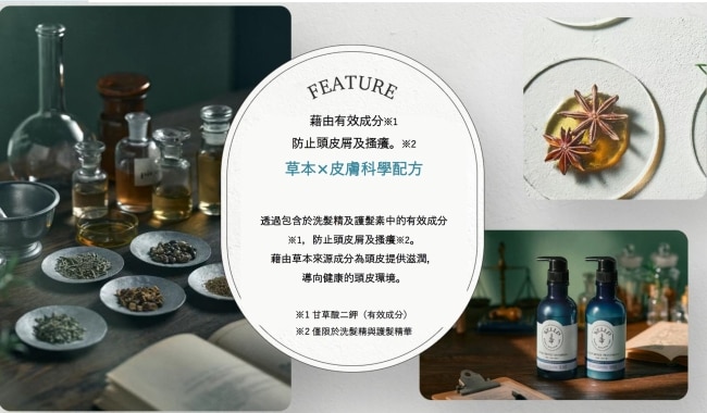 藉由草本×皮膚科學配方防止頭皮屑與搔癢並引導至光滑的毛髮。