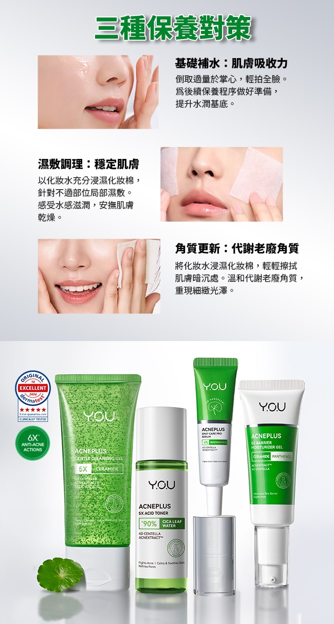 | 主打成分 | 1. Centella Asiatica Leaf Water積雪草葉水 2. AHA / BHA (Salicylic Acid) / PHA5重複合酸 3. Witch Hazel Extract金縷梅萃取 4. AcneExtract™ Botanical Complex專利 AcneExtract™ 植萃複合物 |