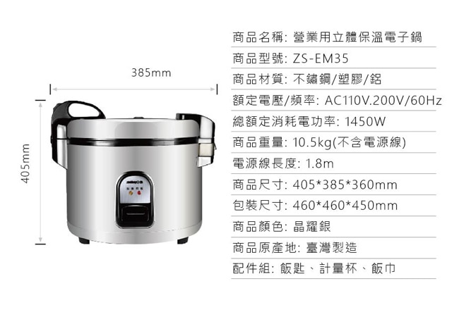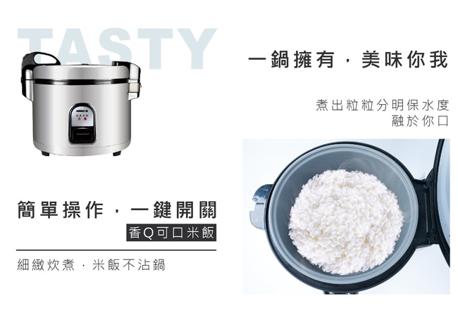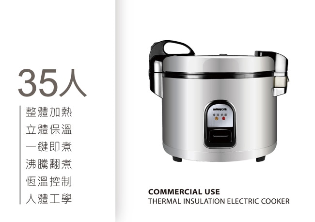 | 商品簡述 | 容量約35人份(約70碗飯) 大容量/營業用/商業用皆適宜 沸騰翻煮恆溫控制 |